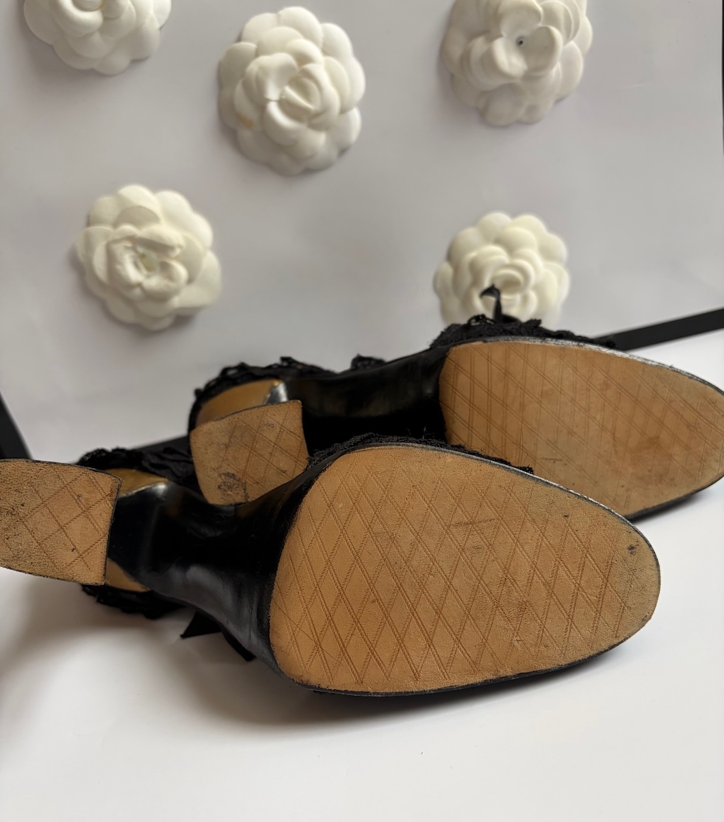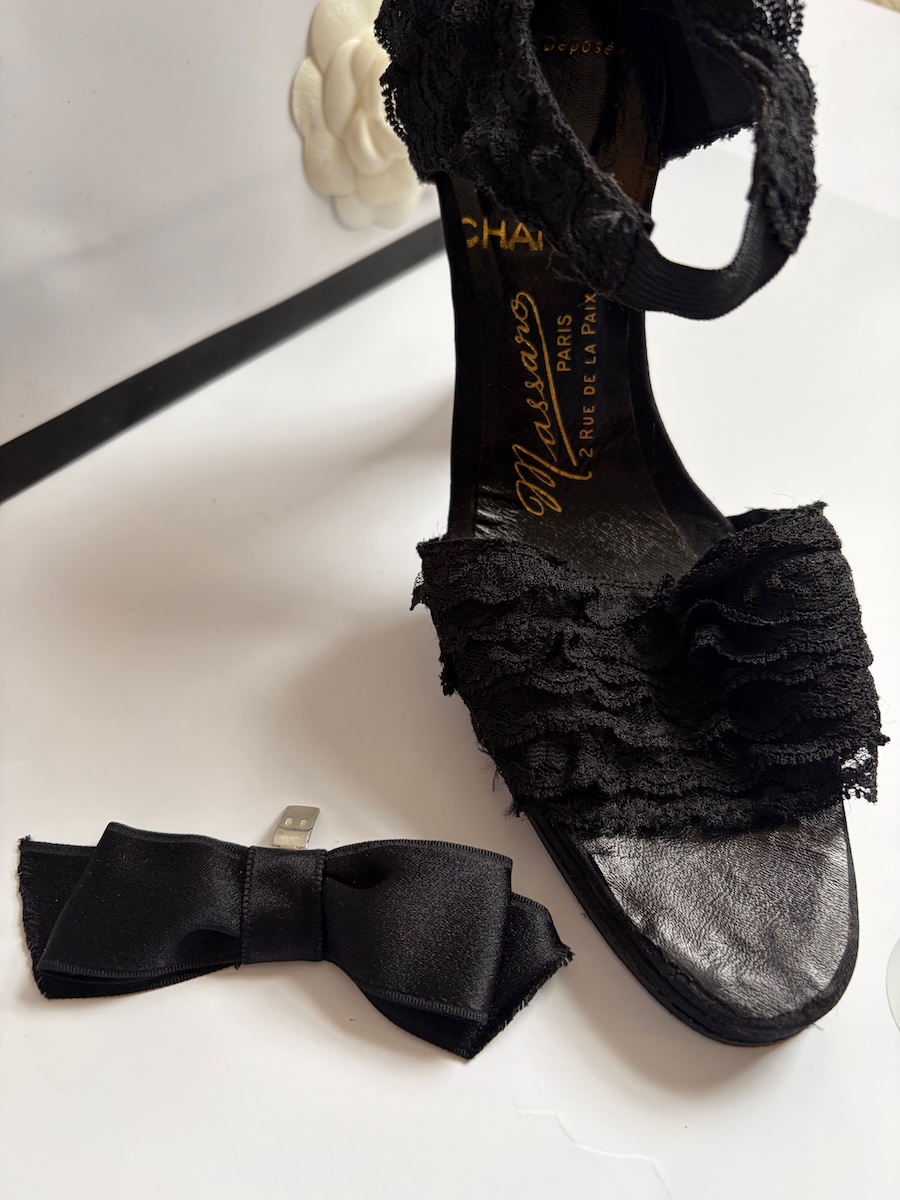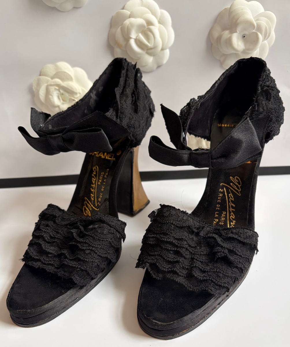 CHANEL By MASSARO Haute Couture Black Lace Ruffles Bow Heels Sandals 1990
