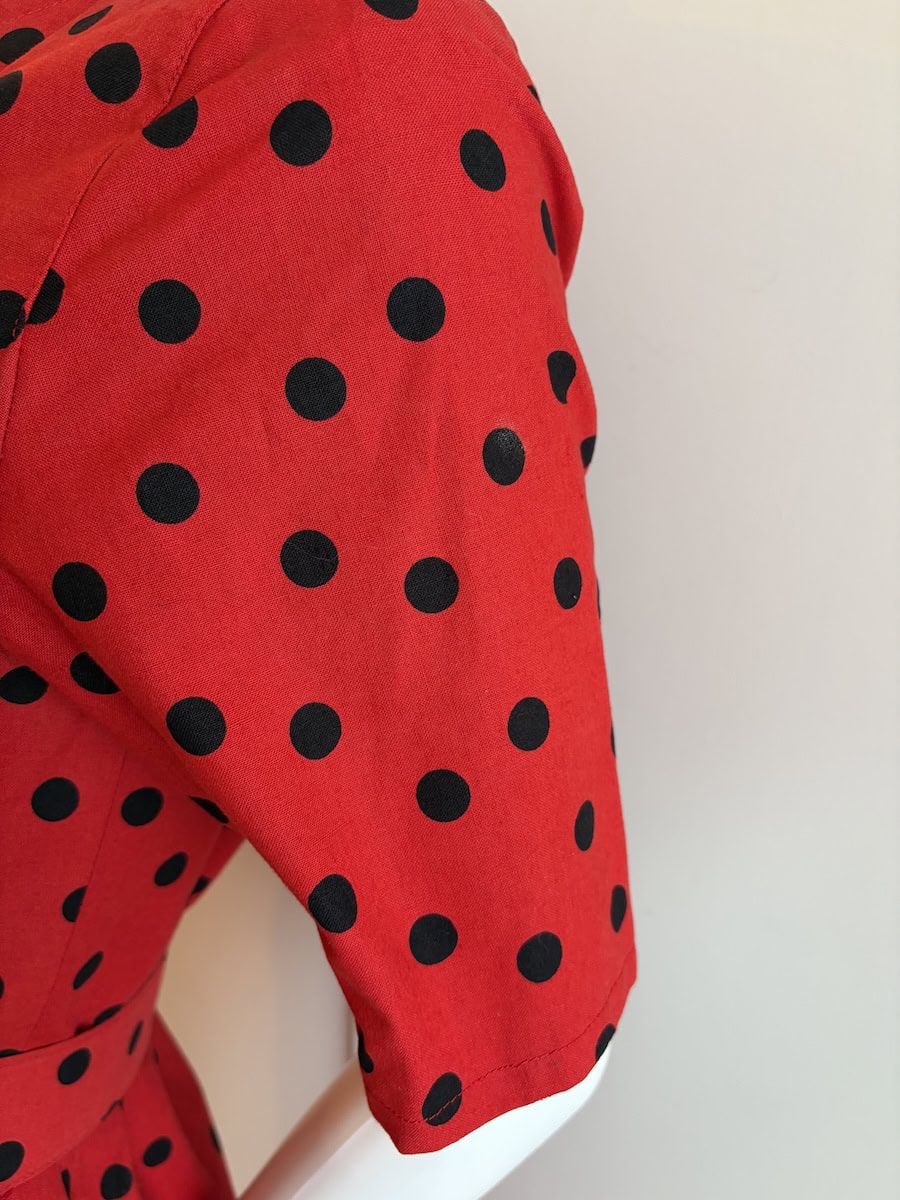 GUY LAROCHE 1970 Vintage Red & Black Polka Dot Pleated Waist Belted Dress