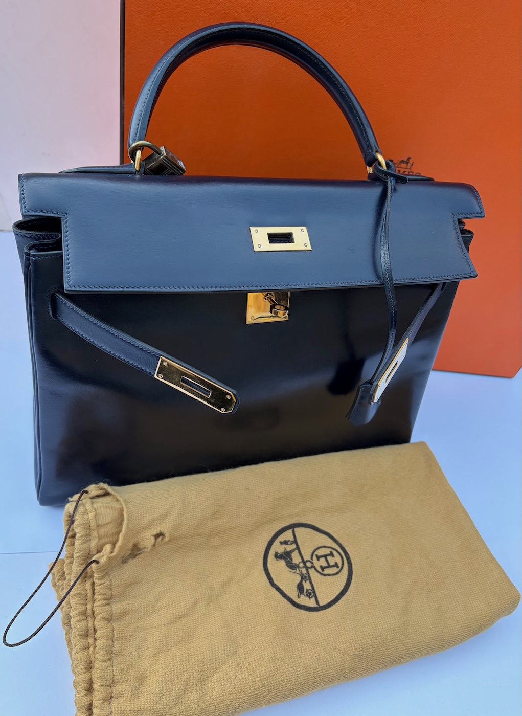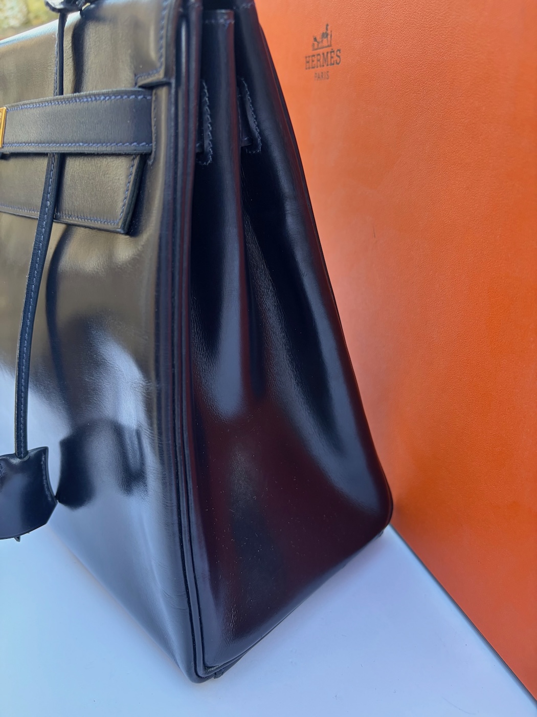 HERMÈS 1979 Iconic Kelly 32 Navy Blue Box Leather Vintage 24k GHW
