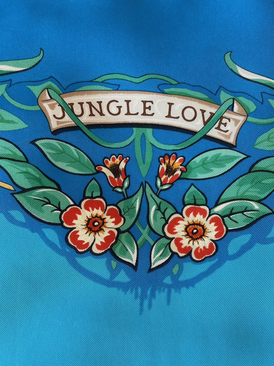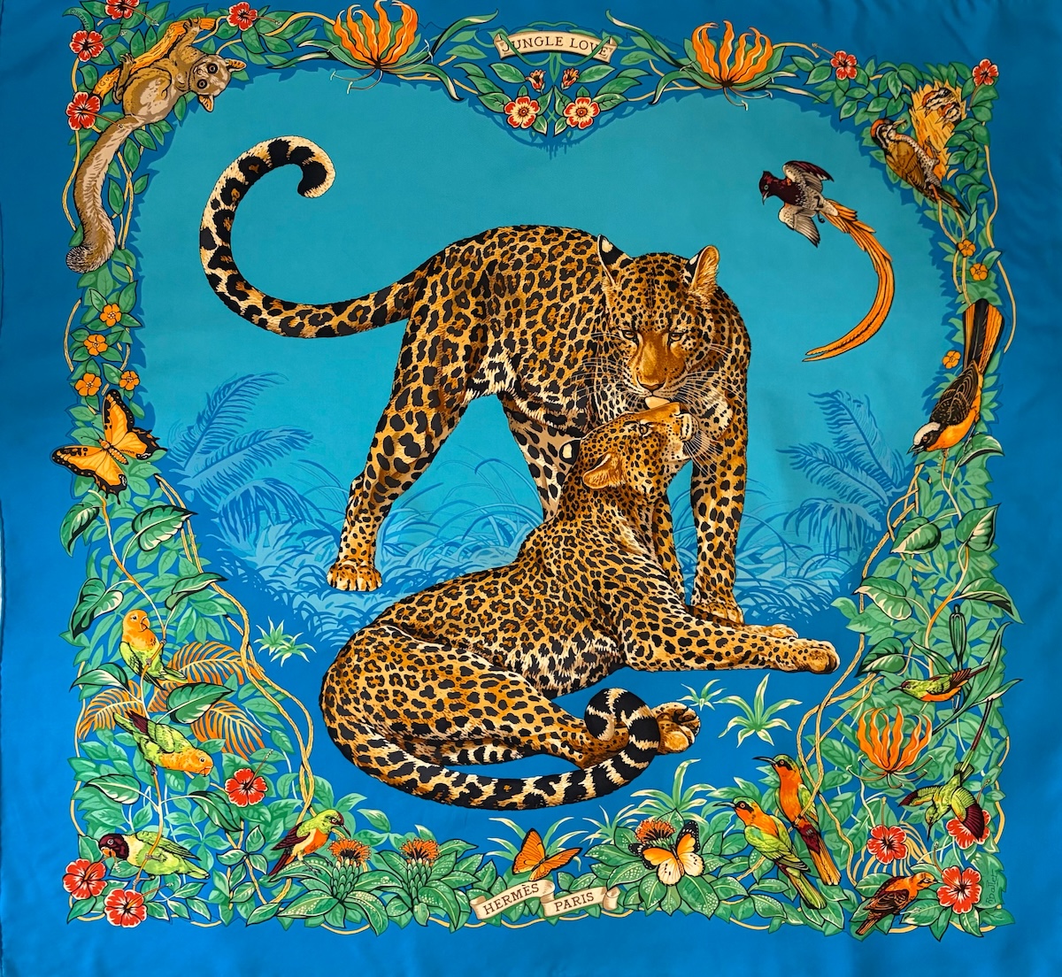 HERMÈS Silk Scarf JUNGLE LOVE Blue Gold By Robert Dallet 2000 First Issue W/Box
