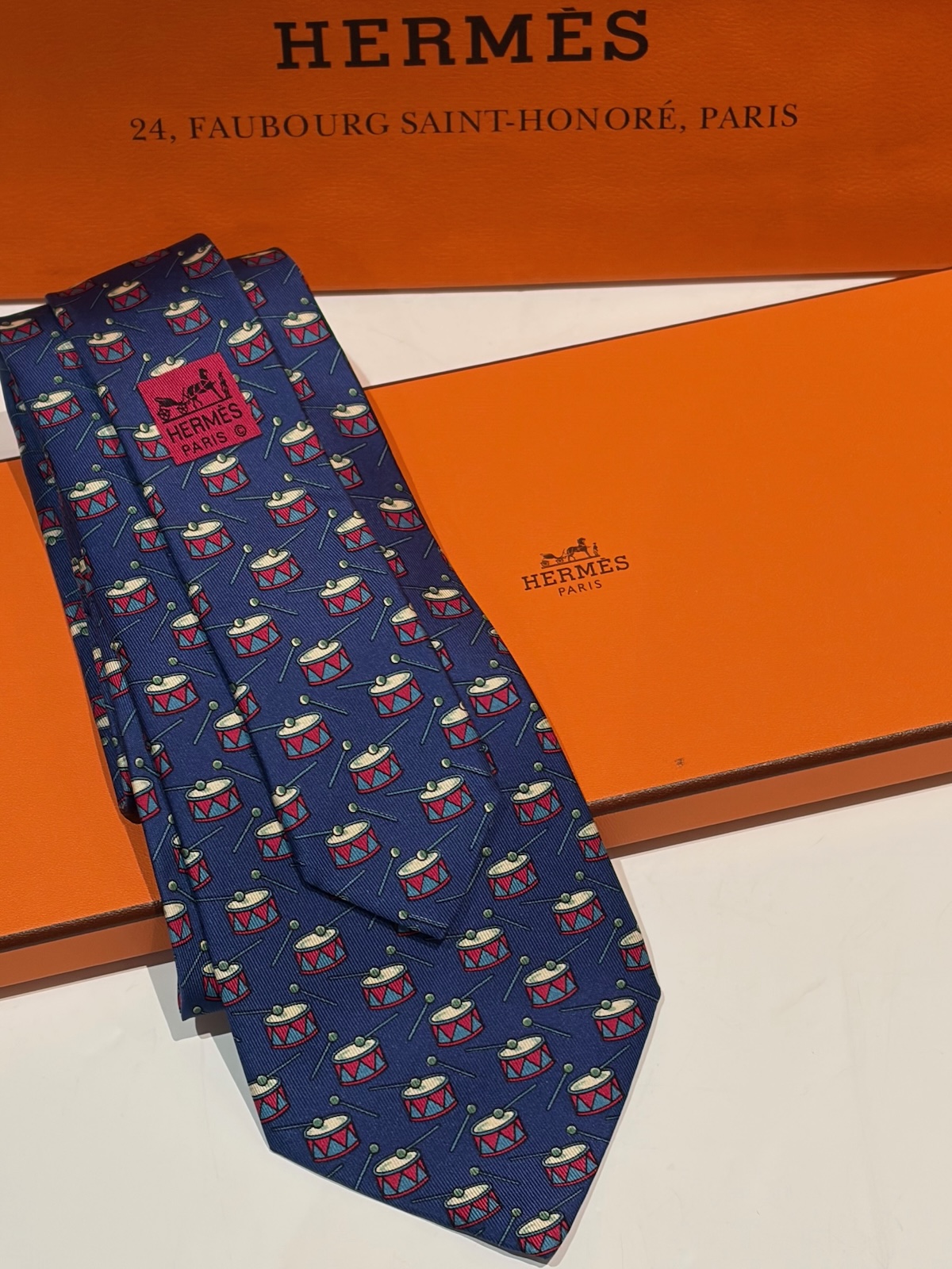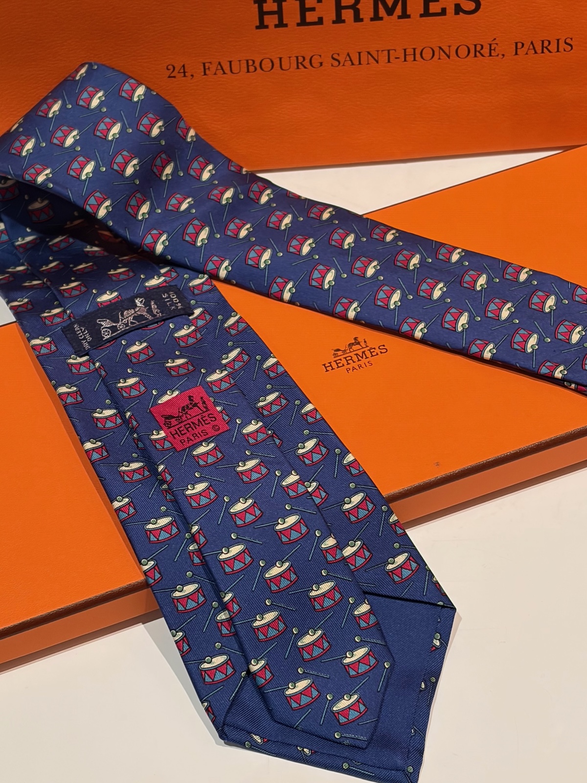 HERMÈS Vintage Tie DRUM-DRUMSTICK Navy Blue Red & White Collector W/Box