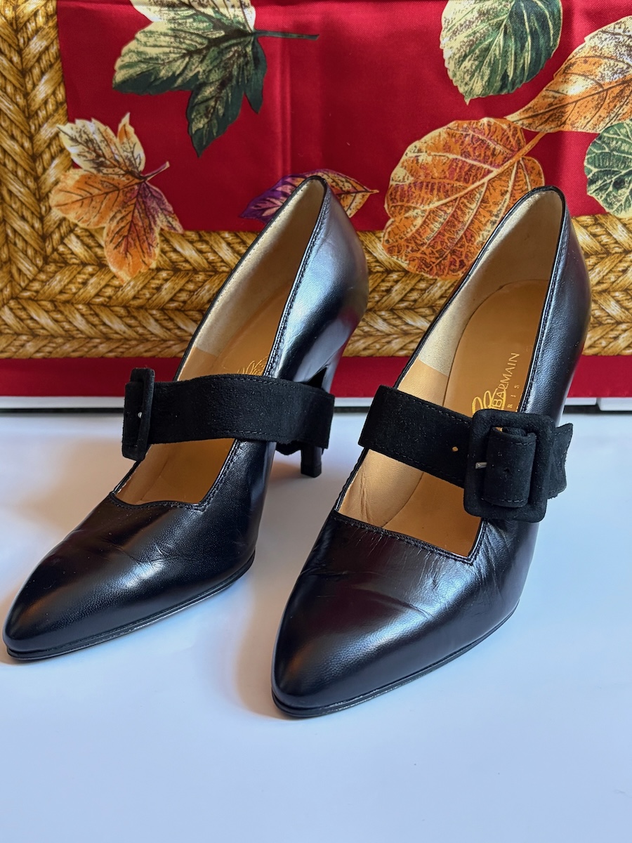 PIERRE BALMAIN By HAREL Haute Couture Kidskin Black Pump With Suede Wrap Strap Buckle C.1990-1991