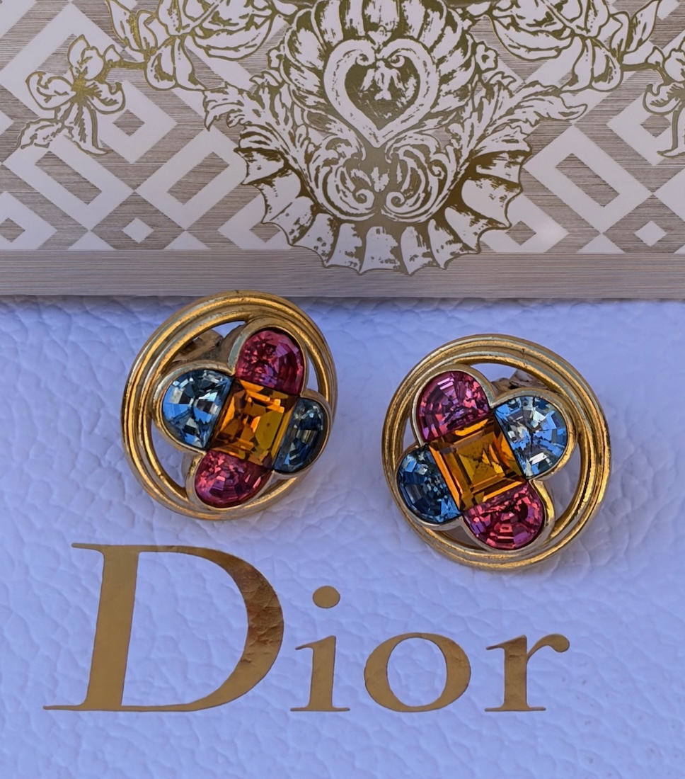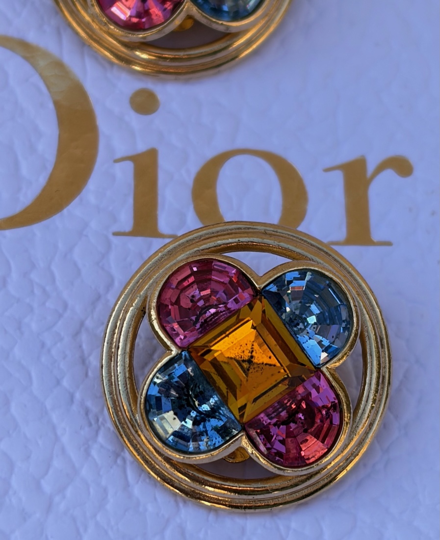 Vintage CHRISTIAN DIOR Paris 1980 Red Blue Yellow Cabochon Glass Crystals Cross Earrings